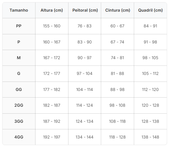 • Tabela de Medidas - Masculina